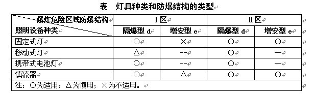 A.灯具的防爆标志、外壳防护等级和温度组别与爆炸危险环境相适配。当设计无要求时,灯具种类和防爆结构的选型应符合下表的规定: