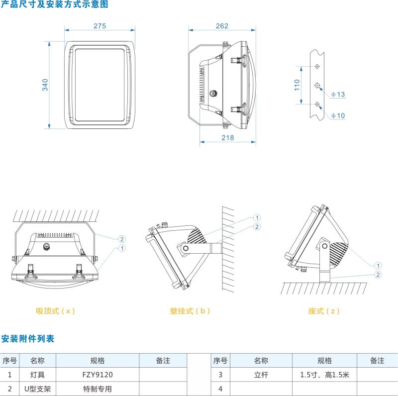 • 安装方式:座式、吸顶式和壁挂式等多种安装方式。照射角度可根据环境需要上下(180°)内调节。