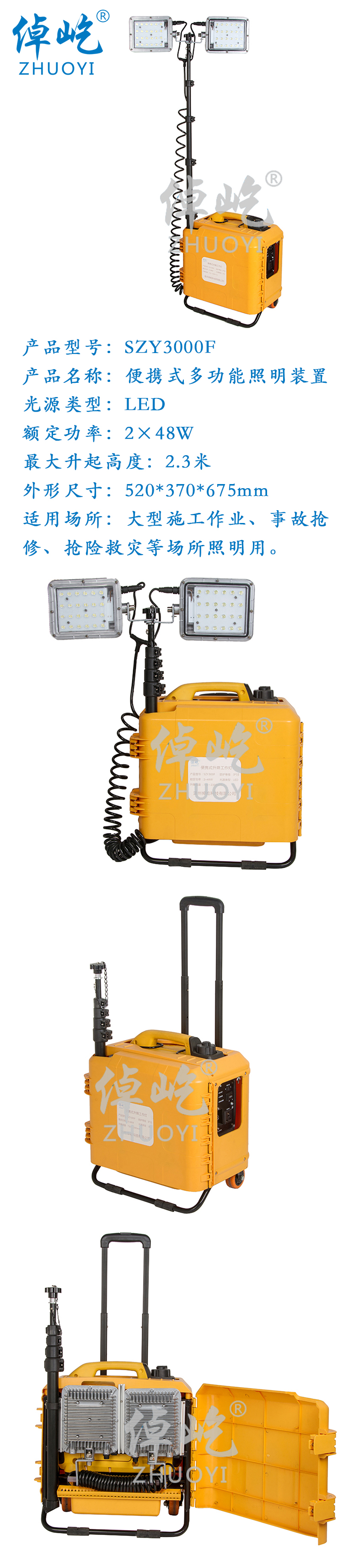 l灯具配备两个移动轮,可在平缓场地拖动,同时配备揹带,在崎岖或路面不适合拖动时,可使用揹带运输。